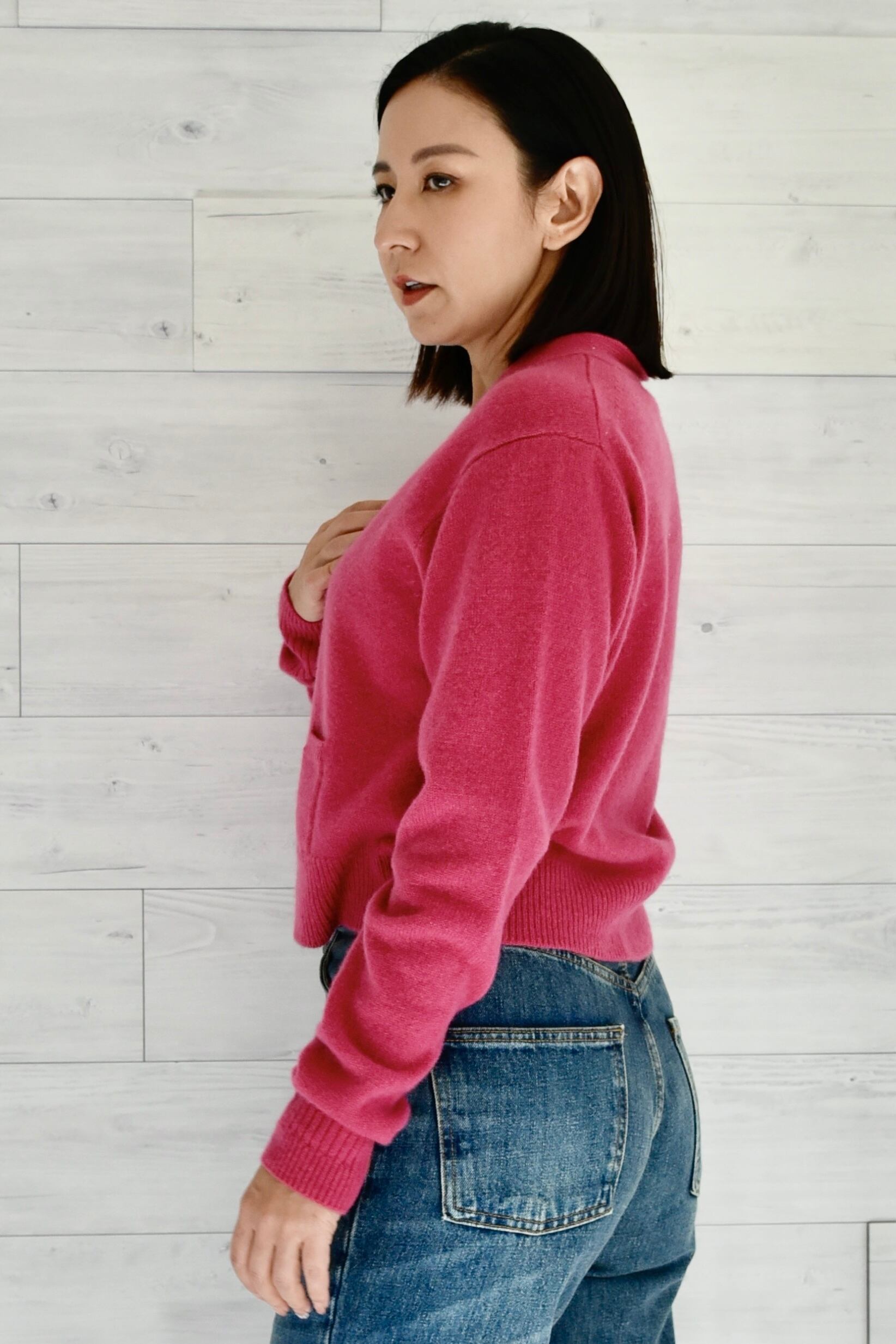 絶妙な着丈とバランスで前を開けて着ても、ボタンを閉めてプルオーバーとしても着用が可能なカーディガンです。左側のポケットはリップ用の小さいポケットで遊び心を!